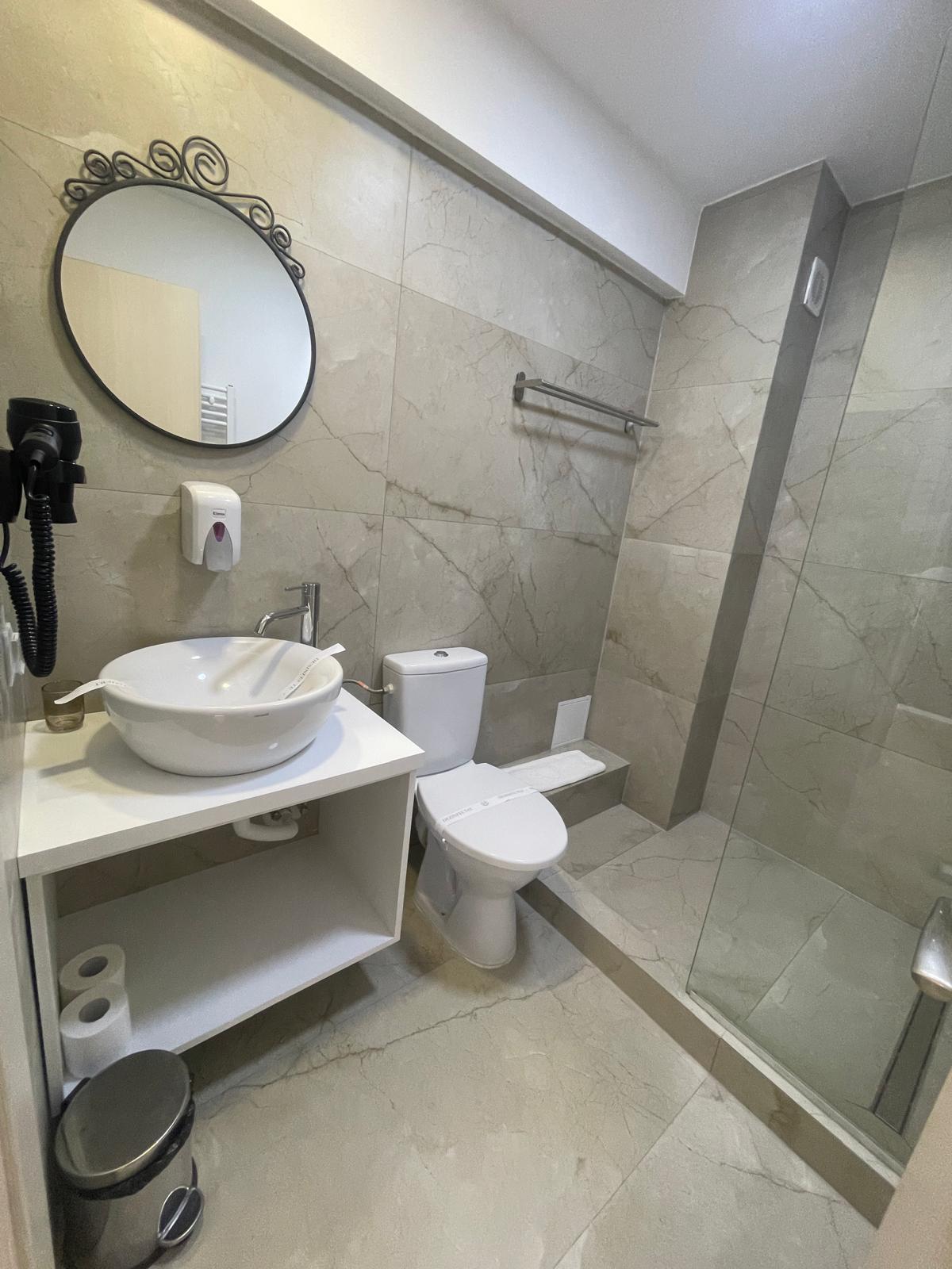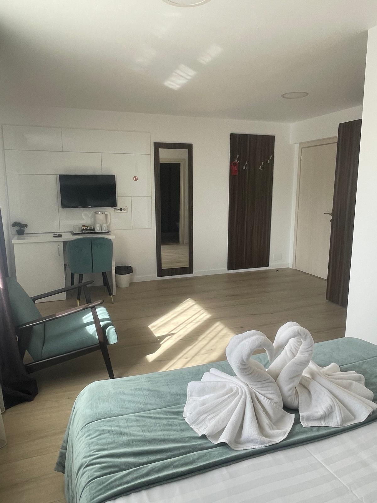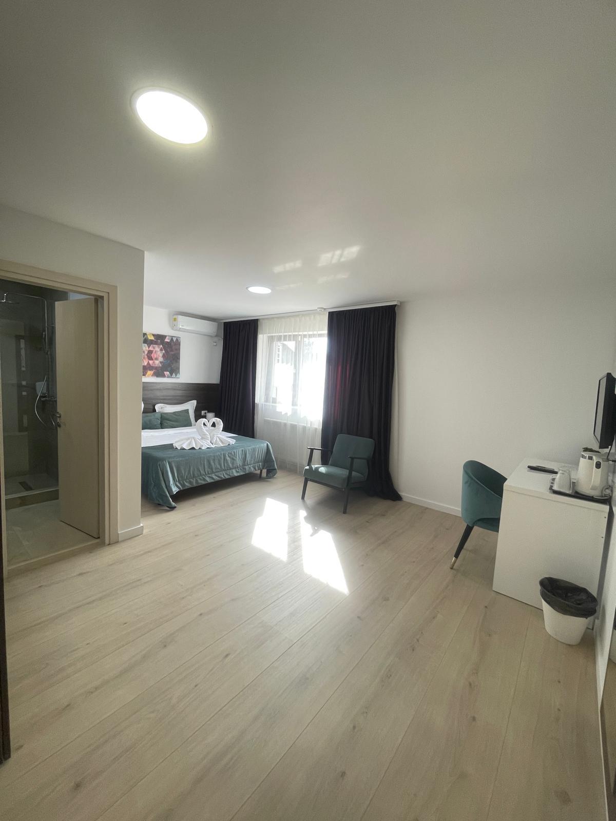 Pentru un maxim de confort, vă punem la dispoziție această cameră dublă premium, spațioasă și elegant amenajată, ideală pentru relaxare. Camera este mobilată modern și dotată complet, oferind un pat matrimonial confortabil (160/200 cm), perfect pentru două persoane. Designul rafinat și atmosfera primitoare contribuie la o experiență plăcută, fie că sunteți în călătorie de afaceri sau în vacanță. Baia proprie este dotată cu duș, pentru un plus de confort.